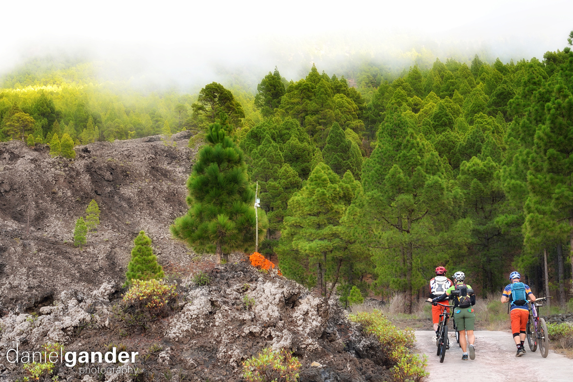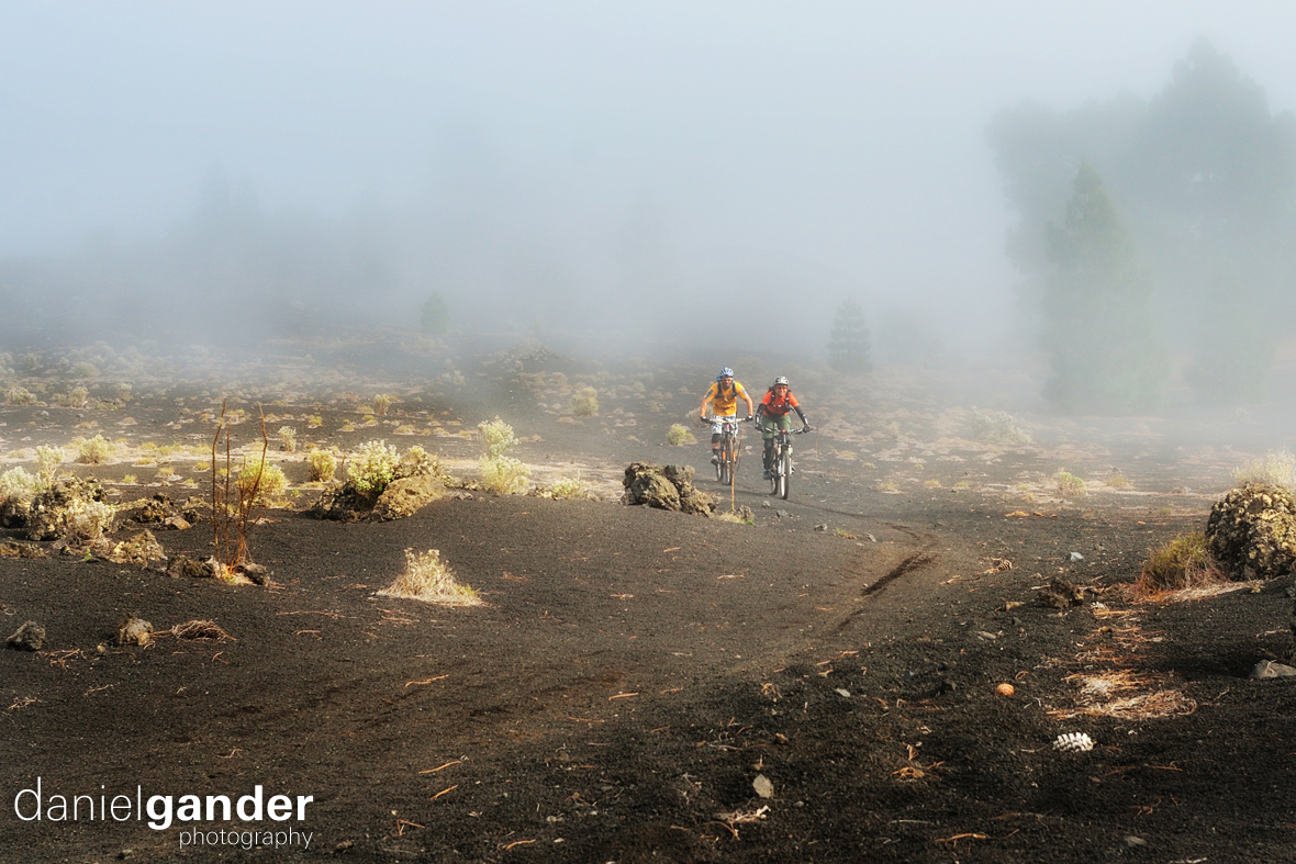 La Palma ist vulkanischen Ursprungs und das ist besonders im südlichen Teil der Insel unübersehbar. Unterhalb von Fuencaliente ist dort 1975 das letzte Mal der Vulkan Teneguía ausgebrochen. Überreste davon gibt es z.B. in Form von erstarrten Lavaströmen und schwarzem Vulkansand im Gelände oder am Strand. Als Mountainbiker war mir diese Art von Untergrund völlig neu und ich empfand die Vulkantouren deshalb als besonders interessant und spannend. So etwas gibt es bei uns ja eigentlich nirgends, vom Gefühl her ist das Befahren eines Abhangs aus Vulkansand wohl am ehesten noch vergleichbar mit Tiefschnee oder verschneiten Trails. Erstarrte Lavaströme bestehen im Gegensatz dazu aus einer riesigen Masse von scharfkantigen, porösen, größeren und kleineren Gesteinsbrocken und diese sind eigentlich nur dort “berollbar” wo der Mensch Hand angelegt und eine Art Weg durch den Lavastrom gebaut hat.